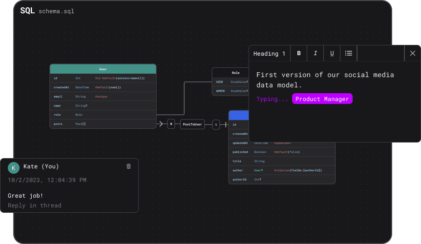 Schema Visualizer toolkits do not stop at the visualization step. Expand and scale your data models with new fields and type definitions. Build also data model in JSON, Prisma, or APIs in GraphQL and Protobuf.